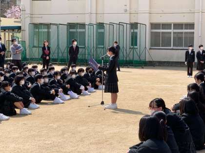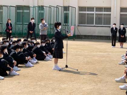 3年生担当の先生の紹介、対面式での歓迎のことば・誓いのことばの様子です。