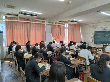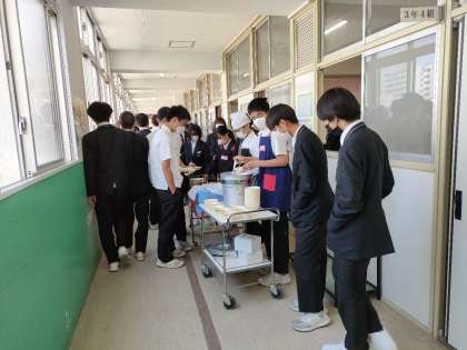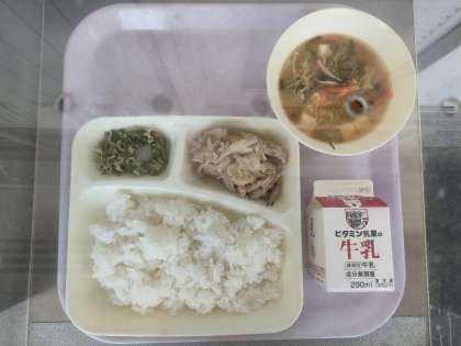 今日の給食は、お味噌汁・豚肉の生姜焼き・ピーマンとじゃこの和物・ご飯でした。