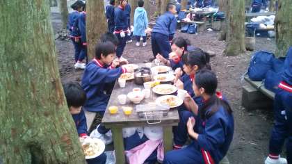 昼食は、班で協力して炊いたご飯に、調理したカレーをかけて、いただきました。心配した雨も何とかしのいで無事に野外炊事が終わりました。