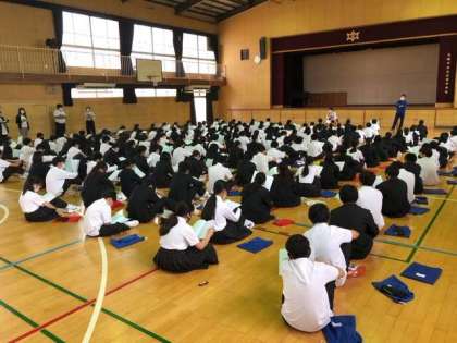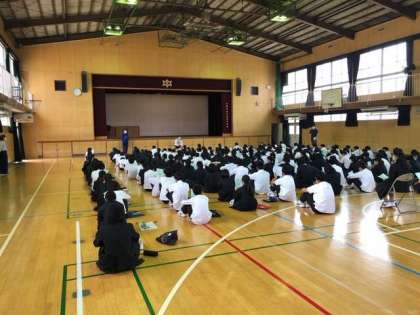 本日の1限目に体育館で一泊移住のしおり読み合わせを行いました。