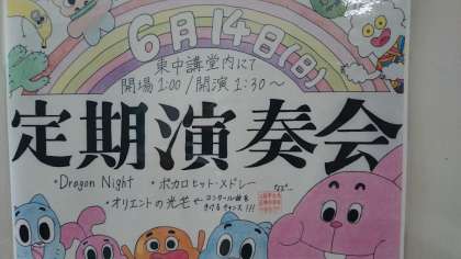 吹奏楽部の定期演奏会を、6月14日(日)午後1時30分より本校の講堂(体育館)で行います。音楽を楽しみたい生徒・保護者をはじめ地域のみな様の参加をお待ちしています。なお、会場は午後1時から開場します。