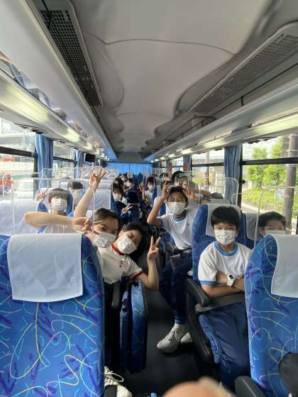 5組のバス車内の様子です。 素早く行動して、予定より早く学校を出発することができました。