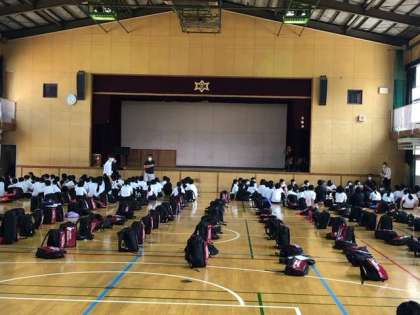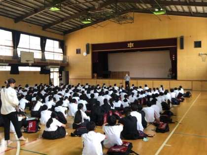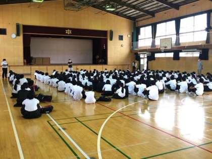 本日、1年生は2時間目から登校し、体育館で健康観察を行いました。