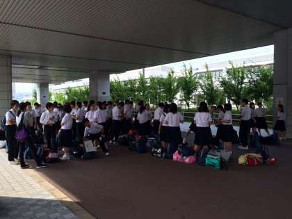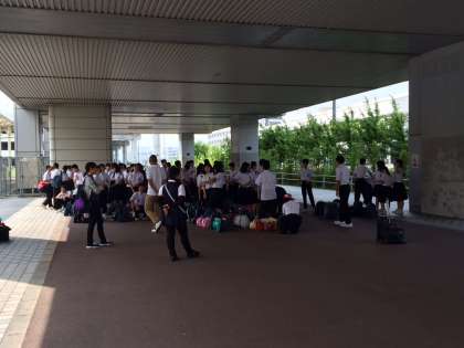 集合場所のモノレール駅高架下に、集まりつつあります。みんなはしゃいでいます。