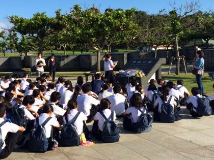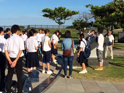 平和祈念公園の「平和の礎」前で、「平和セレモニー」を行い、黙祷そして千羽鶴を捧げました。