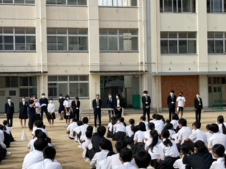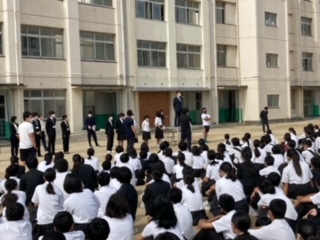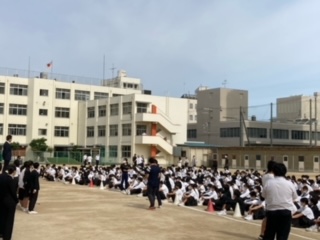岡本先生の指揮で、グラウンドに集合し生徒会の司会で始まります。