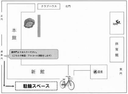 *なお、概ね16:30以降の夕方以降で、通用門が閉まっている場合は正門から入校後、(自転車は中庭近辺にとめてください)各教室で検温・消毒をお願いすることになります。(また、遅い時間帯は使用できる階段も緑色階段のみになっている場合もございます。ご了承ください。)