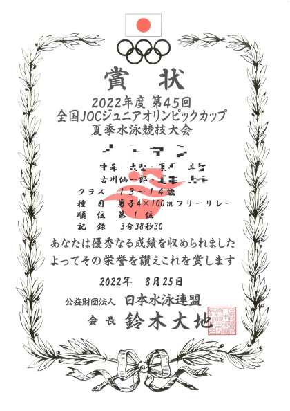 本校3年生男子生徒が、水泳競技において、中学校全国大会出場に続いて、うれしい知らせを持って帰ってきてくれました。