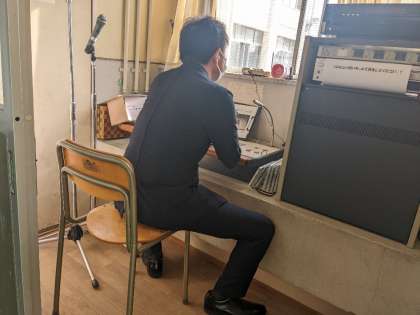 本日、朝から気温が高いため、急遽グラウンドでの全校集会を放送で行いました。