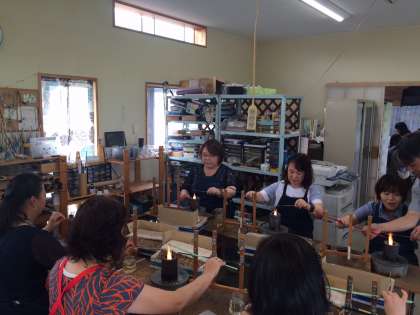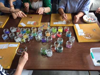 午前中は、ガラス工房で、フュージングとトンボ玉に分かれて体験しました。