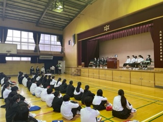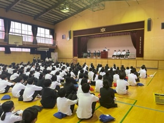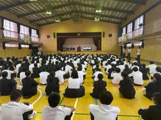 1・2年生は、ソーシャルディスタンスを取りながら、体育館に集会して行いました。