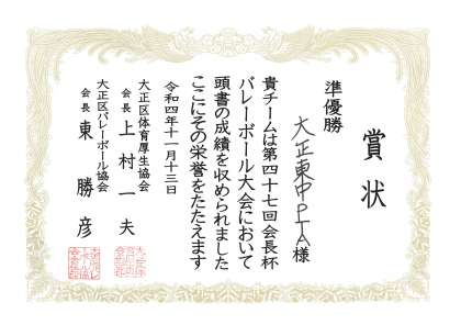 第47回会長杯バレーボール大会で準優勝の賞状をいただきました