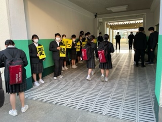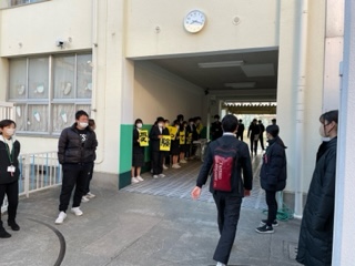 本日、朝8時10分の通用門開門時から、生徒会が代表して、受験応援です。