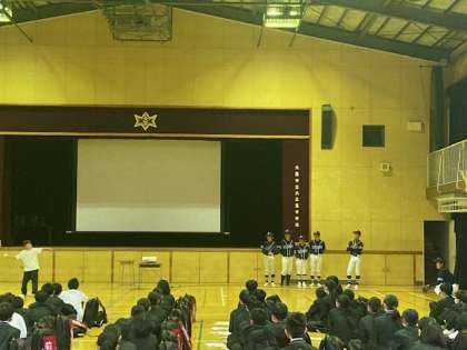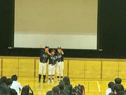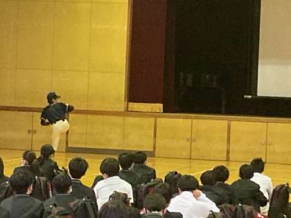 軟式野球部の紹介です。実際のピッチングに始まり、1年生による始球式、さらには野球部に入部した時の注意事項などの紹介がありました。