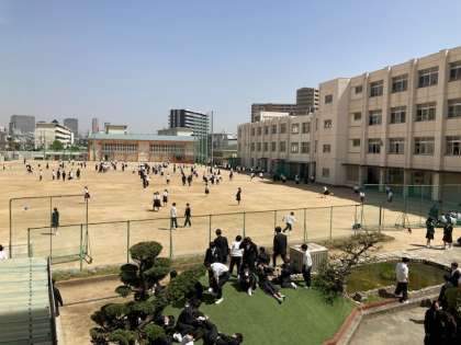 ぽかぽか陽気に誘われて、たくさんの生徒が外でお昼休みを楽しんでいます!