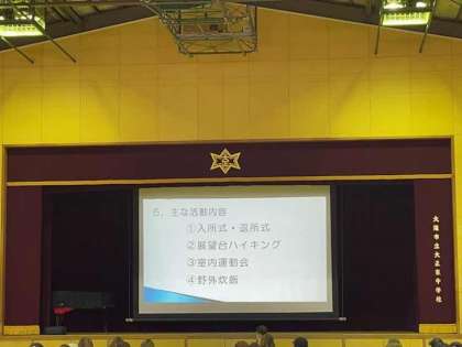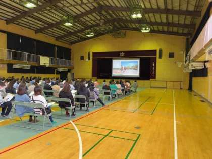 本日、1年生の保護者の方向けに一泊移住の説明会を体育館で行いました。