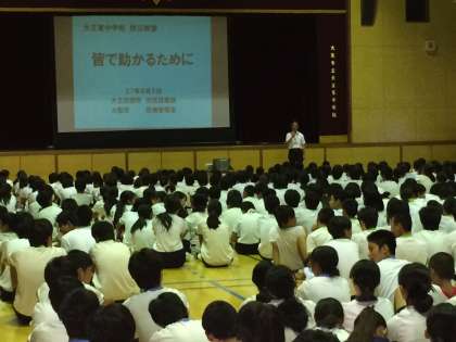 1時限 体育館において、大阪市危機管理室の山崎章夫様にご来校いただき、南海トラフ地震のような巨大地震が発生したときに地域で助け合うことの大切さについて講義していただきました。