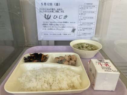 さけのごまみそ焼き 五目汁 ひじきのいため煮 ご飯 牛乳