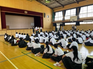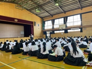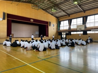 本日3.4時間目、3年生は体育館で、明日からの修学旅行の前日指導です。