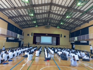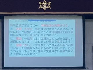 亘先生から、職場体験を成功させるためには、日々の学校生活を充実させることも重要。それに向けて、明日から?時間を守ろう?服装に気を配ろう?言葉遣いを丁寧に!とお話がありました。