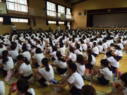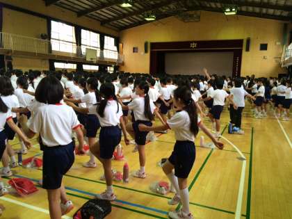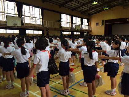9月24日、雨天のため「体育大会 全体練習」を体育館で行いました。狭い体育館に全学年が入り、整列の練習をしたり、行進ができないためその場での足踏み練習をしたりしました。