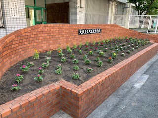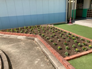 元気アップの緑化事業で、正門前と中庭にかわいいお花がたくさん植えられています。一気に華やかになっています。これからも楽しみです。元気アップのみなさん、ありがとうございます!