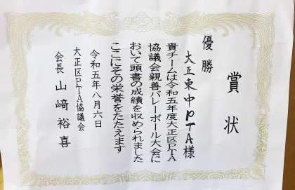 8月6日(日)に行われた大正区PTA協議会親善バレーボール大会にて見事、優勝しました!本校のバレーボール部顧問も参加して、生徒たちからの大声援も受けて、4試合を乗り越えました!おめでとうございます!!