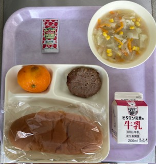 焼きハンバーグ 豆乳スープ みかん(冷) 黒糖パン 牛乳