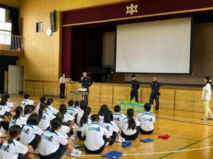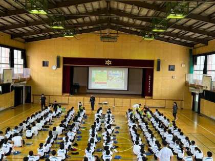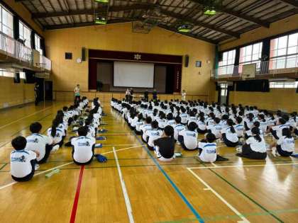 5限目、1年生は体育館で消防署の方の話を聞き、防災研修を行いました。