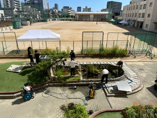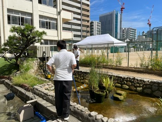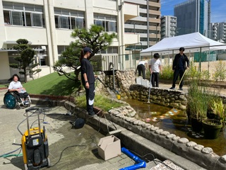 本日、7.8組合同で生活単元学習として、校庭の池清掃を実施しました。