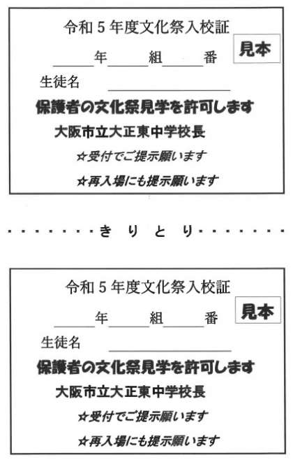 本日、お子様を通じて、明後日の文化祭の保護者の方の入校証を配布しております。
