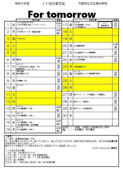 明日の文化祭が終われば、11月です。早いもので、今年も残りあとわずか!まずは、11月の行事予定をしっかり確認しましょう。