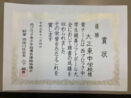 11月4日、千島グラウンドにて行われた西ブロック中学生親善ソフトボール大会で本校の3年生有志チームが優勝しました!!