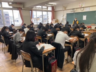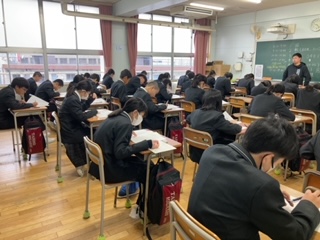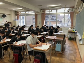 今日は1・2年生がチャレンジテスト、3年生が第5回目の実力テストです。みんな一生懸命にテストに取り組んでいます。