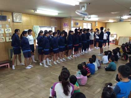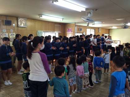 幼児たちから「さんぽ—となりのトトロ」を歌ってもらい、お返しに合唱コンクール金賞曲「証」を披露しました。