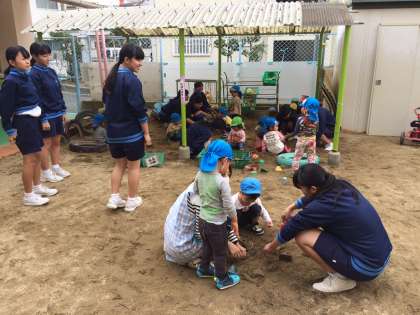 3年生の家庭科の授業の一環で、3年生4組が大浪保育所へふれあい保育に行きました。