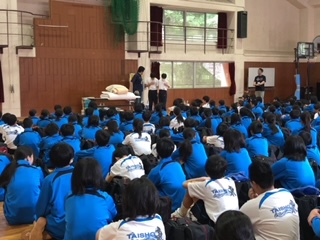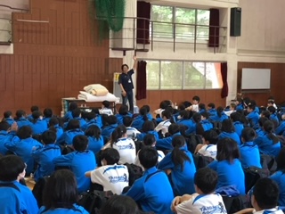 大阪府立少年自然の家のスタッフの方から、「この2日間は自分のことは自分でやりましょう。」ということで、シーツの畳み方などをレクチャーを受けています。