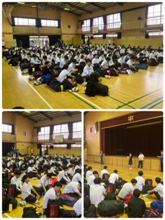 ついに待ちに待った修学旅行です。雨の中の登校でしたが、なんとか全員集合完了。出発式が行われています。