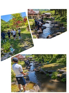 渓流釣り体験の様子です。空と木々の色がとても鮮やかです。