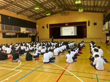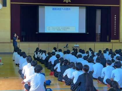本日5・6時間目、3年生は体育館で進路指導主事の村上先生による進路学習を行いました。