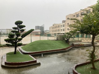 今朝はしっかり雨が降っています。徐々に止むようです。タオルと替えの靴下を準備しましょう。少し早めに家を出発しましょう。また、傘をさすことで、視界が悪くなり、普段より道に広がってしまいます。周囲の状況に気を配りながら登校してください。