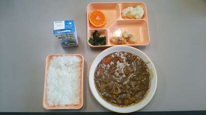 冬野菜の和風カレーライス・ほうれん草・ちくわのてんぷら・カリフラワーのピクルス・みかん・米飯・牛乳