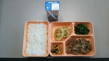 牛肉の甘辛煮、れんこんの磯辺揚げ、ほうれん草のごまあえ、煮豆、米飯、牛乳