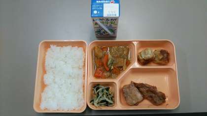 鶏肉の中華みそ焼き、いかと野菜のうま煮、揚げシューマイ、ニラともやしの炒めもの、米飯、牛乳