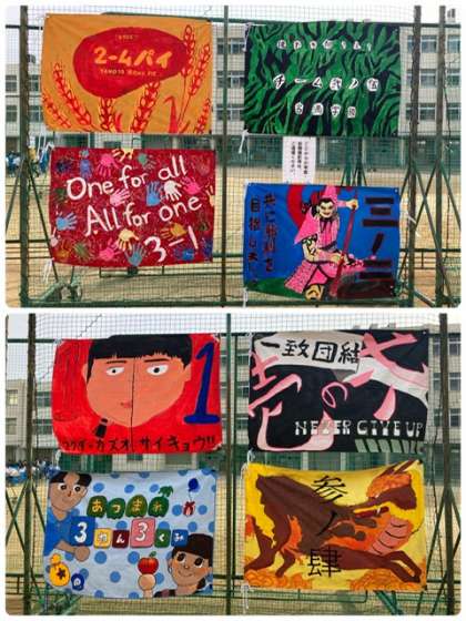 この体育大会に向けて、各クラスで力を合わせて学級旗を作成しました!