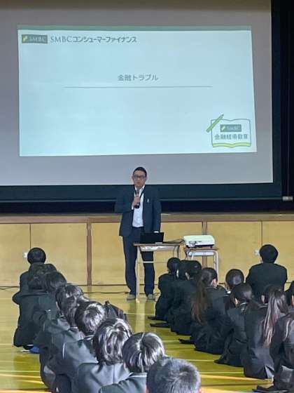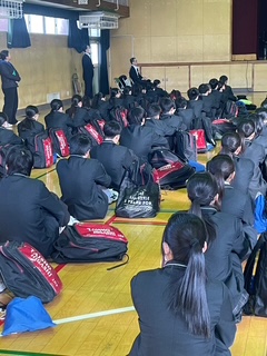 2年生、2学期の最後の学年集会には銀行の方をゲストにお迎えしました。