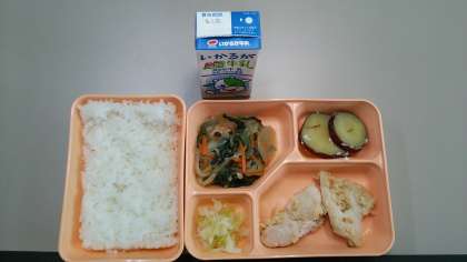 鶏肉のマヨネーズ焼き・野菜ソテー・さつまいものバター煮・キャベツのピクルス・米飯・牛乳