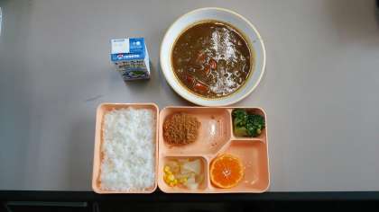 ミンチカツカレーライス・ブロッコリー・だいこんのドレッシングあえ・みかん・米飯・牛乳