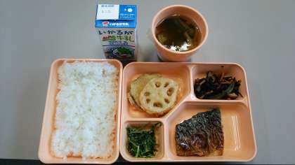 鯖のみそ煮、てんぷら(さつまいも、れんこん)、ひじきの煮もの、水菜のおひたし、すまし汁、米飯、牛乳