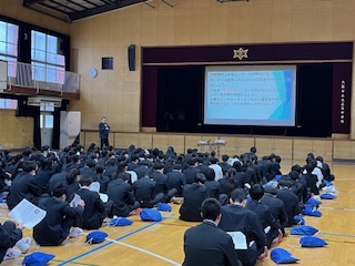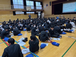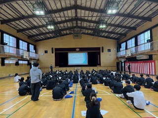 体育館で、道徳推進教育の亘先生から、道徳の授業を受けました。